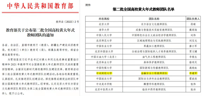 近日,教育部正式公布了第二批全国高校黄大年式教师团队,共200个团队入选,我校金融学院院长李建军教授领衔的金融安全工程教师团队获评第二批“全国高校黄大年式教师团队”。团队由金融学院、管理科学与工程学院、统计与数学学院、信息学院的学科带头人和...
