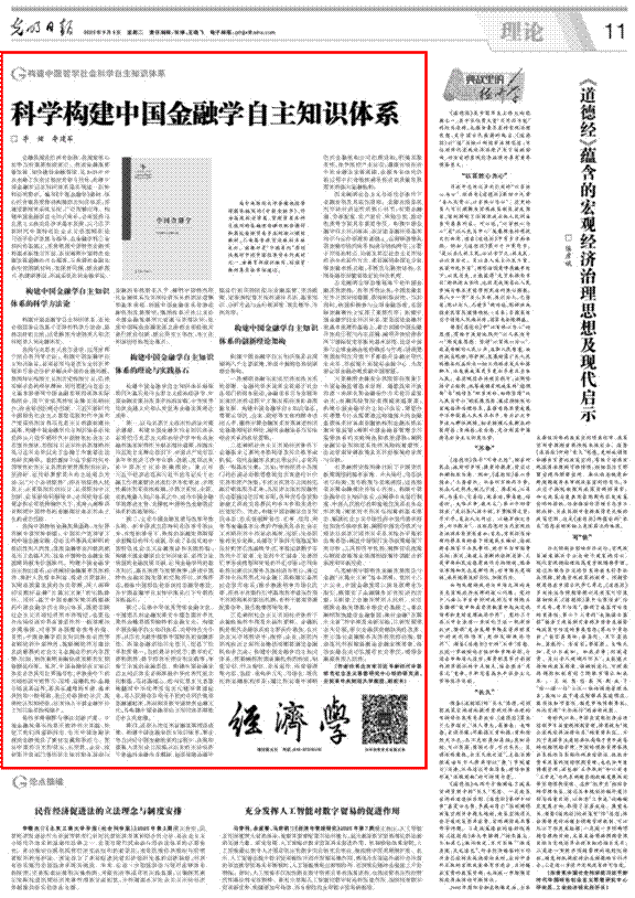 9月9日,《光明日报》理论版刊发我校李健教授、副校长李建军教授题为《科学构建中国金融学自主知识体系》的署名文章。文章阐述了构建中国金融学自主知识体系的四梁八柱,包括其必要性、科学方法论、理论与实践基石以及创新理论架构。